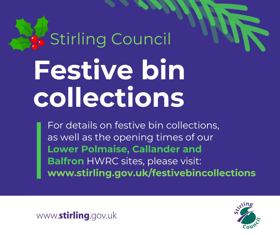 Stirling Council’s Waste Services team, we would like to wish everyone a Merry Christmas and a Happy New Year.”For details on festive bin collections, as well as the opening times of our Lower Polmaise, Callander and Balfron HWRC sites, please visit:www.stirling.gov.uk/festivebincollections