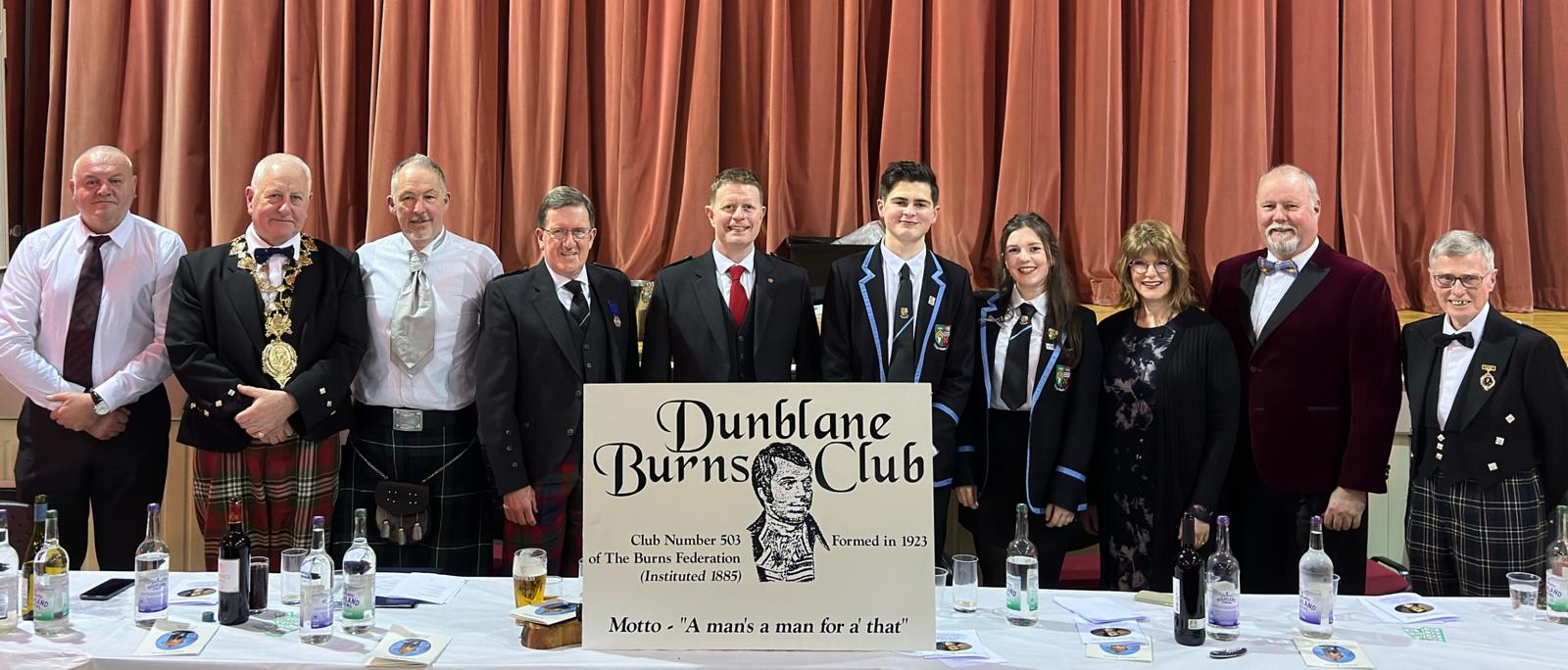 Dunblane Burns Club celebrated its centenary in style on Friday 9th Feb. 132 people packed out Victoria Hall and their generous donations enabled the event to raise over £1500 which will go to the chosen charities of the Dunblane Centre and Dunblane High School. The full programme is available below :