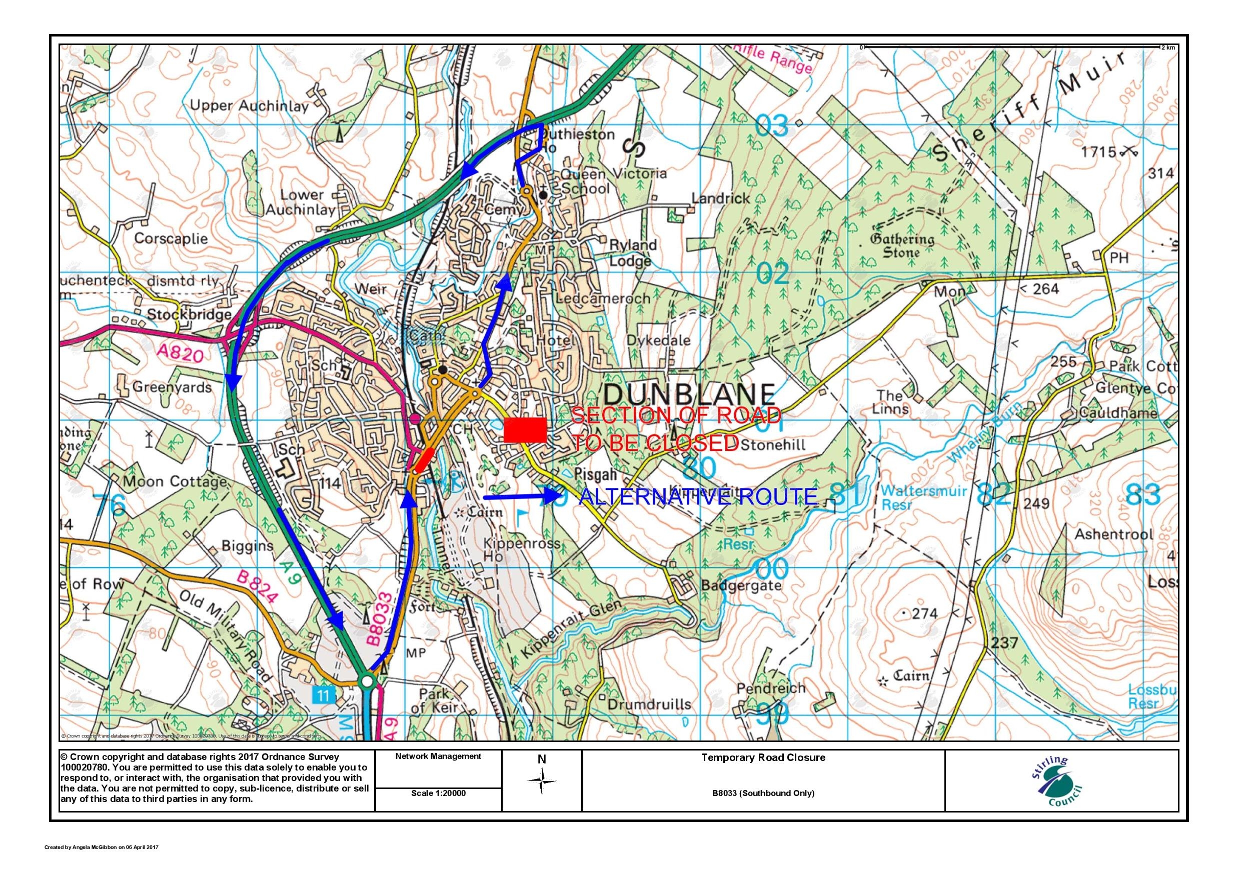 NOTICE IS GIVEN that, under the Road Traffic Regulation Act 1984 (as amended), Stirling Council will close the road as an emergency:- B8033 (Southbound Only) From the junction of Sunnyside to the roundabout at Claredon Place from 10-4-17 until 12-4-17 to facilitate carriageway inlay works. Alternative Routes: via B8033, A9, B8033. Emergency service access will be maintained. See the Plan