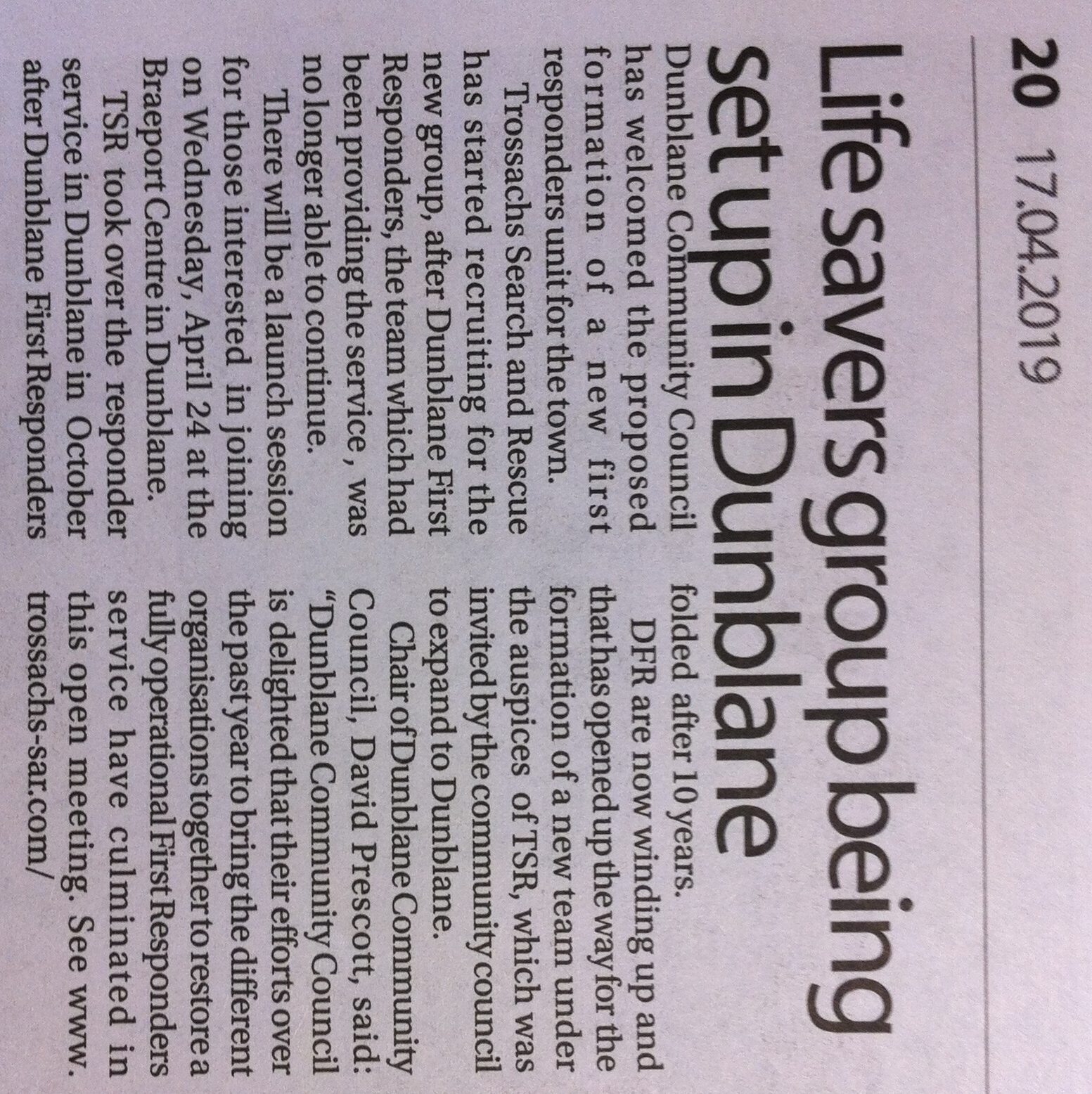 A public meeting was held on Wednesday 24 April in the Braeport Centre. The meeting was jointly sponsored by Scottish Ambulance Service, Trossachs Search & Rescue and Dunblane Community Council.