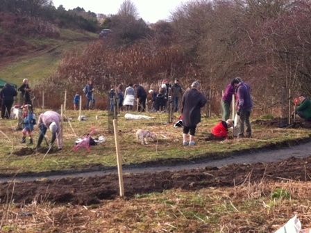 Dozens of people including lots of children have been out on the Laigh Hills today planting fruit trees – a great success!