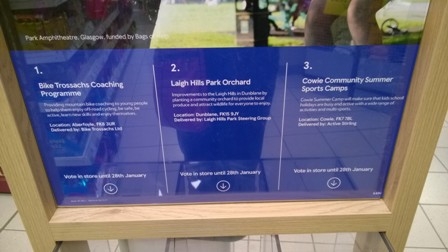 Voting will take place from 2nd January to 28th January and we will be notified by the end of February 2017 confirming the amount of funding that we will receive. The project with the highest number of votes across the Stirlingshire region will receive £5,000, the second placed project £2,000 and the third placed project £1,000.So can I urge you to vote whenever you go to Tesco. You should get a voting token whenever you have any transaction in store – it doesn’t matter how small and you do not have to buy a bag. But you will probably have to remind the person on the checkout to give you a token.