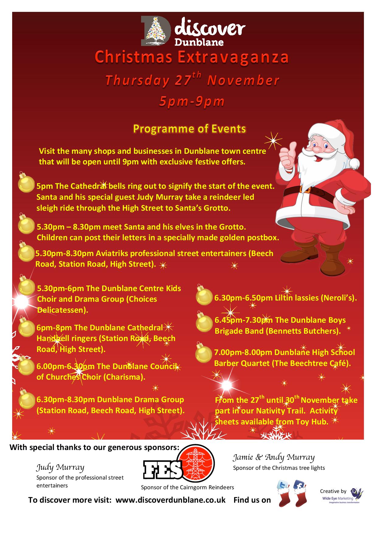 There is a full programme of events for all to enjoy, with lots to see and experience including, bell ringers, carol singers, choirs and even acrobatic elves. With help from dancing star Judy Murray the streets will be decked full of entertainment and fun. We are delighted to again have the support from the Dunblane Development Trust, to help ensure the event runs smoothly.