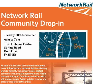 Community Drop-in Before the piling work starts, Network Rail is hosting a community drop in event where members of the public can come along and meet the project team to ask any questions and discuss the work. Tuesday 28th November, 4pm – 7pm, the Dunblane Centre, Stirling Road, Dunblane, FK15 9EY. Download the Flyer